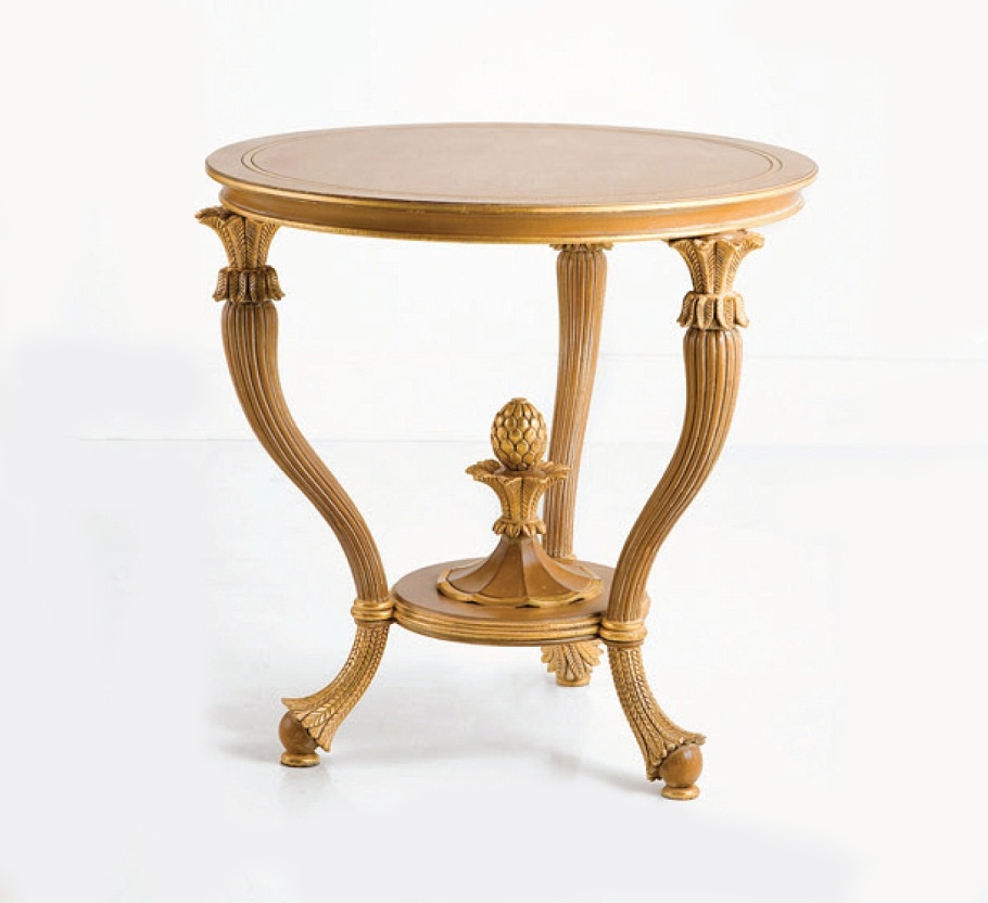 Round coffee-table from the Italian manufacturer Chelini. The model handmade on carved legs. The frame is made of solid wood. The product covered in gold leaf, will decorate any interior in a classic style.