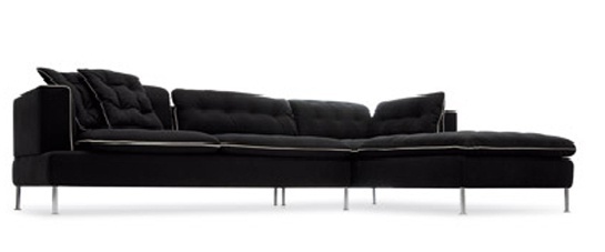Sofa from Italian manufacturer Calligaris. Model with low backrest and armrests. Frame fully covered by leather black. Low legs in chromed metal. Decoration is a number of decorative cushions of different sizes.