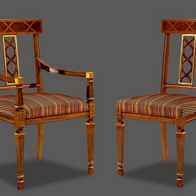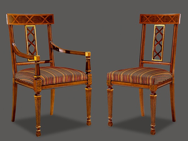 Chair with high back from the Italian manufacturer Busnelli Adamo. Presented options for chairs with or without armrests. Hard back decorated with carvings and Golden paintings. Seat cover fabric, it is possible to select from a range of companies. A style classic.