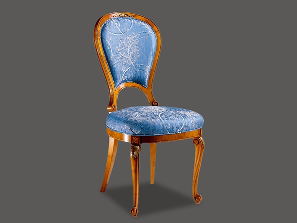 Chair with high back from the Italian manufacturer Busnelli Adamo. A chair with oval backrest. Front two legs are decorated with carvings. Upholstery textiles blue. A style classic.