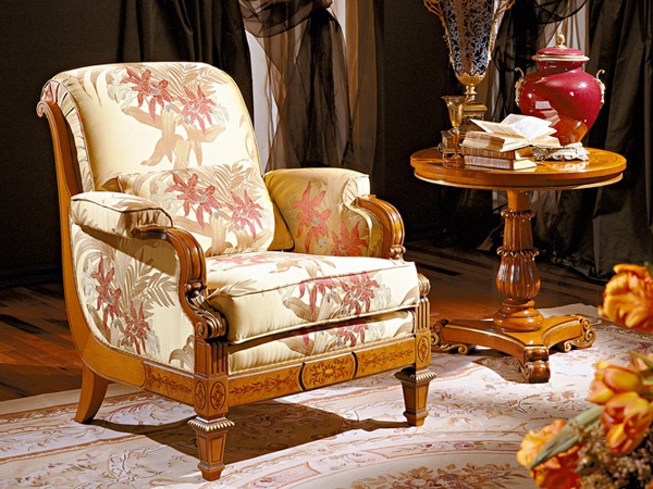 A chair from the Italian manufacturer Busnelli Adamo. Presents a model chair with a high back and armrests for small feet. The frame is natural wood legs with decorative carved elements. A style classic.