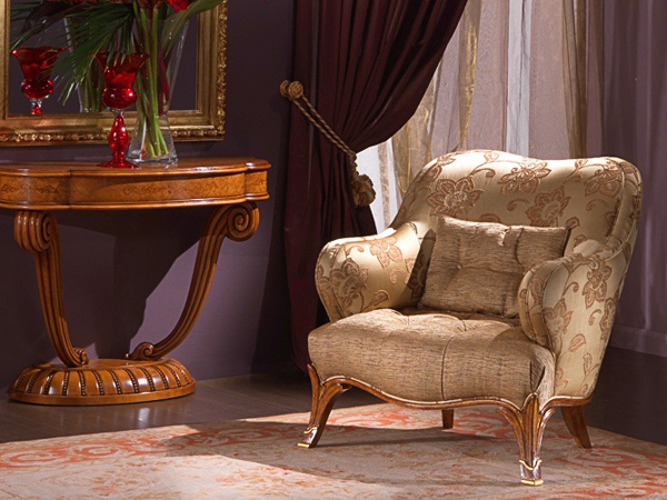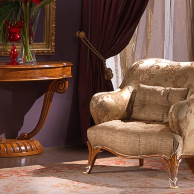 Chair in a classic style from the Italian manufacturer Busnelli Adamo. Presented chair for small feet. Frame made of wood, legs are decorated with decorative elements. Upholstery is high-quality textiles gray. A style classic.