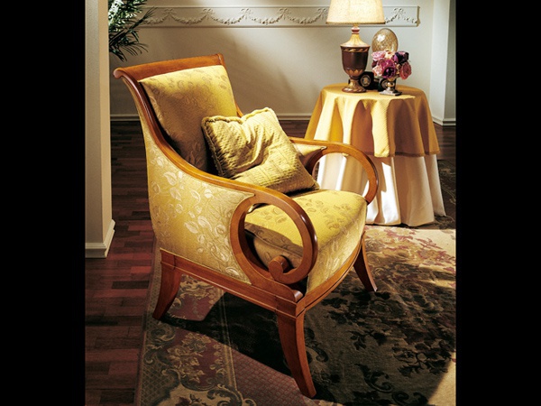 A chair from the Italian manufacturer Busnelli Adamo. An exclusive model of the high-backed chair. Upholstery is beige textile. Original armrests. Frame made of natural wood, lacquered legs low. A style classic.