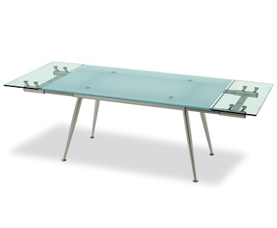 Dining table from the Italian manufacturer Calligaris. The model is made in modern style. Material - metal. Legs supplemented by tips. Countertop rectangular from transparent glass. The working surface can be increased due to the additional tabs.