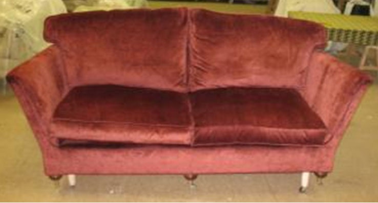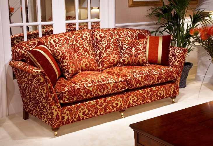 Sofa Ruskin manufacturing English company Duresta. The frame is made from hardwood. Legs red or black wood, front legs on casters. The seat cushion and backrest is soft, with spring blocks. Upholstery textile, in red colors, unique fabrics of different textures. The complementary decorative sofa pillows to match the upholstery of the sofa, filler - fluff. Sofa executed in classical style.