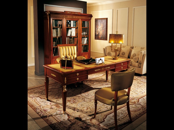 Headsets for the office from the Italian manufacturer Busnelli Adamo. The presented model bookcase, Desk and chair. Frame made of wood, legs are decorated with decorative elements. Chair fabric in bronze color. A style classic.