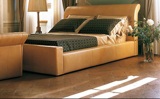 Double bed Juliet, from Italian manufacturer Danti. The frame is made of wood. Colors - brown. The headboard is tall and upholstered in fabric or leather. The headboard is wrapped. The legs are made of wood. The model is made in classic style.