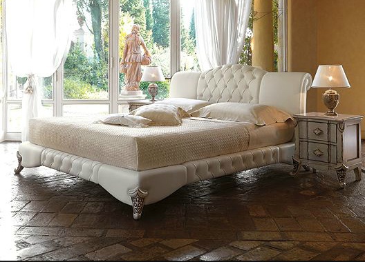Double bed Morris, from the Italian manufacturer Danti. The frame is made of wood. Color scheme - white. The headboard is tall and upholstered in fabric or leather. The legs are made of wood with carved elements. The bed is decorated with stitch. The model is made in modern style.