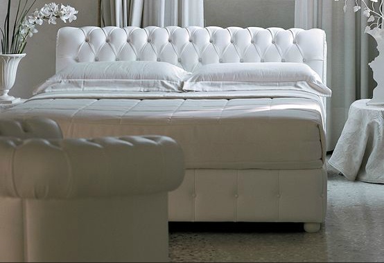 Bed double Royal, from the Italian manufacturer Danti. The frame is made of wood. Color scheme - white. The headboard is tall and upholstered in fabric or leather with padding. The legs are made of wood. The model is made in modern style.