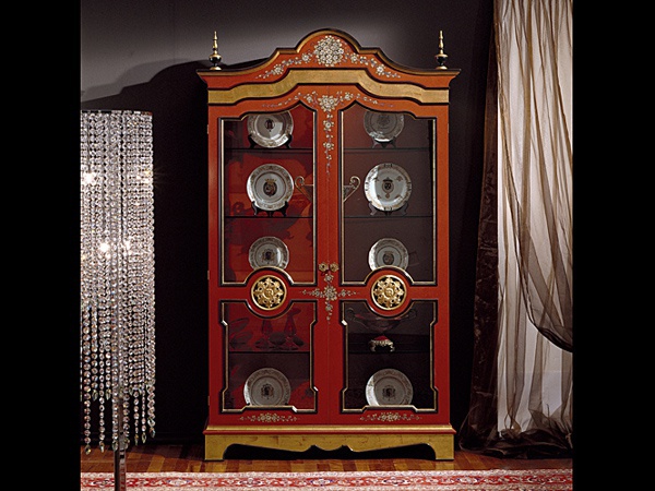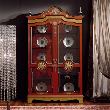 Showcase from Italian manufacturer Busnelli Adamo. Showcase with original decorations in Golden color. The model is made of wood with glass doors. The color is a dark natural wood. A style classic.