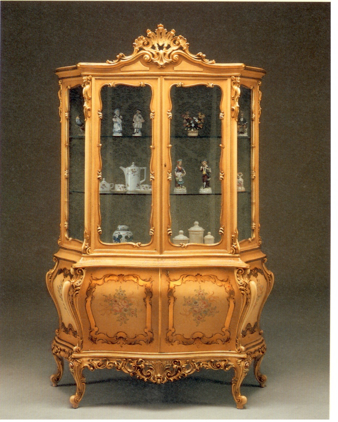 Showcase from Italian producer Francesco Meroni. Design in the Rococo style. Frame made of solid wood. Finish gold hand painting. Colours in stock.