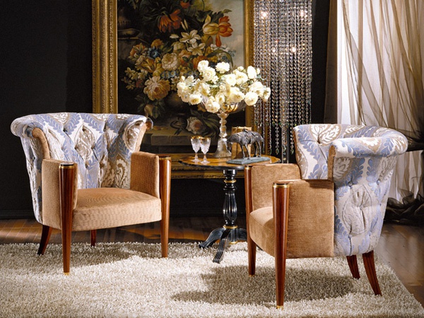 Chair in a classic style from the Italian manufacturer Busnelli Adamo. Exclusive chairs, will add a note of solemnity and uniqueness. Frame made of natural wood, front legs turning into arms. As if the model is divided into two parts with different tone upholstery. The modern style of execution.