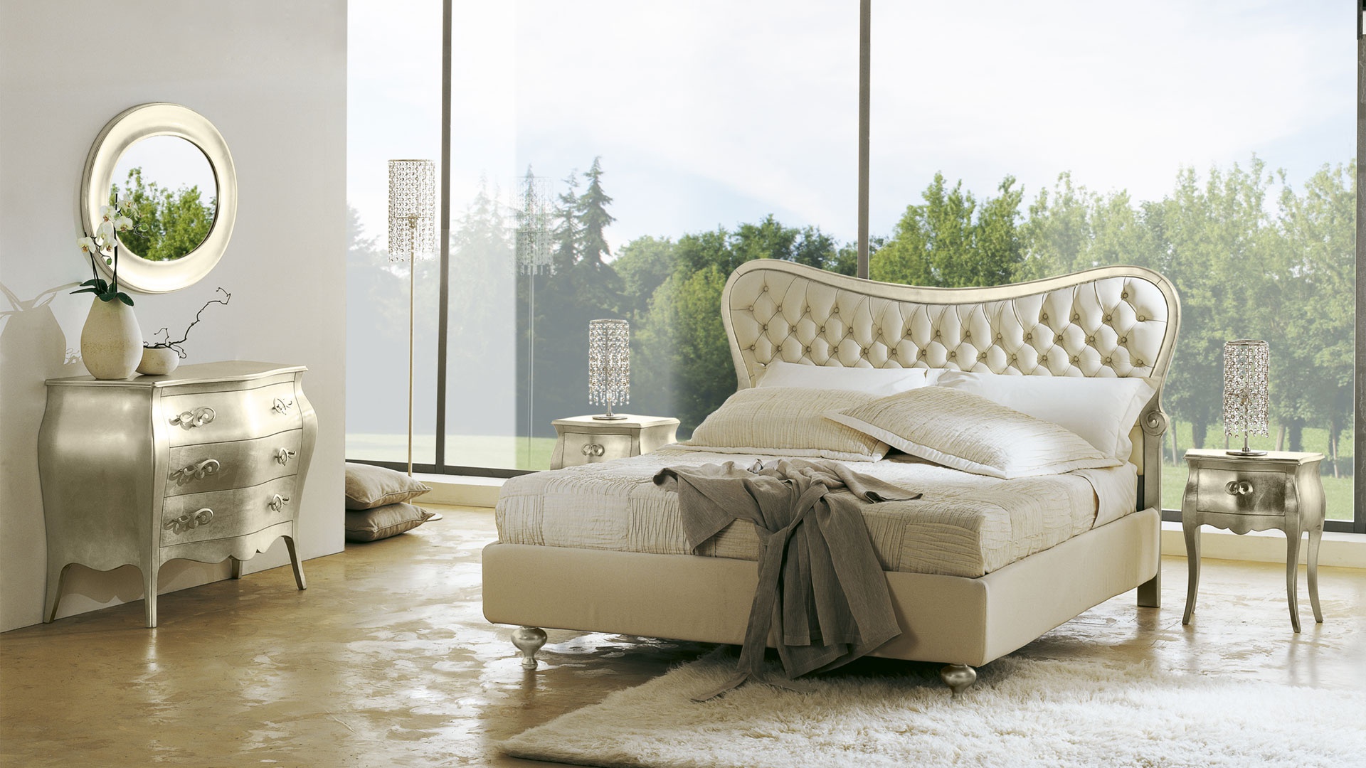 Set for bedroom Hermes from the Italian manufacturer Cantori. Set includes double bed, two bedside tables and a chest of drawers. Frames made from solid wood. Finish - silver foil. The headboard is covered with textiles. The ornament serves as a decorative stitch-Capito. Accessories metal.