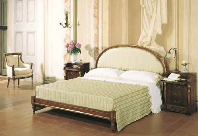 Rossini bed from Italian manufacturer Caspani Tino. Body and legs made from solid wood. Finish option to choose from a collection company. The rounded headboard is covered with textiles. The model is made in classic style. Perfectly fit and beautify the interior of your home.
