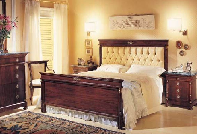 Double bed Goldoni from the Italian manufacturer Caspani Tino. Model with a high headboard and footboard. The frame and legs made from solid wood. The surface is covered with a glossy varnish. Upholstery textile or leather. The ornament serves as a decorative stitch-Capito.