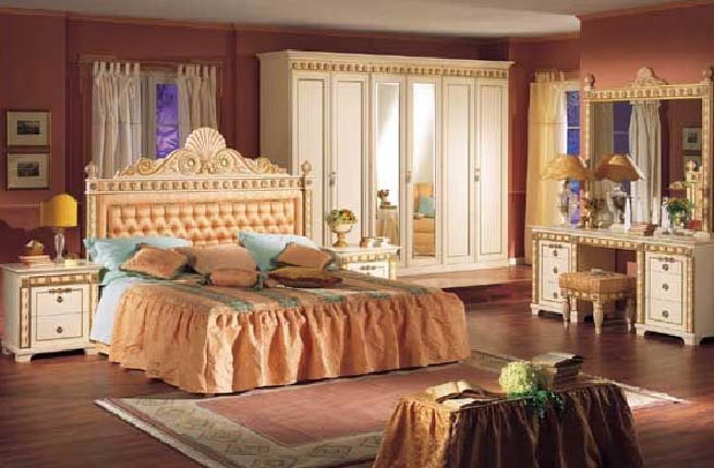 Set for bedroom New York from the Italian manufacturer Caspani Tino. Consists of double bed, two bedside tables, Dressing table, stool and wardrobe. Material - solid wood. The surface is treated with lacquer. Accessories metal. Textile upholstery with decorative stitch-Capito. Each model is richly adorned with decorative carvings handmade.