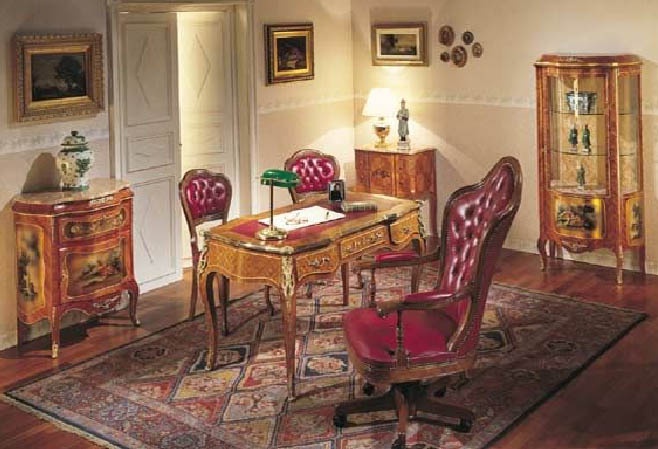 Headsets for the office from Superga Italian manufacturer Caspani Tino. Includes Desk, chair, two chairs, a dresser and a window. Material - solid wood. The surface is covered with a glossy varnish. Accessories metal. The sash and glass shelves. Leather upholstery with decorative stitch-Capito. Set made in a classic style.