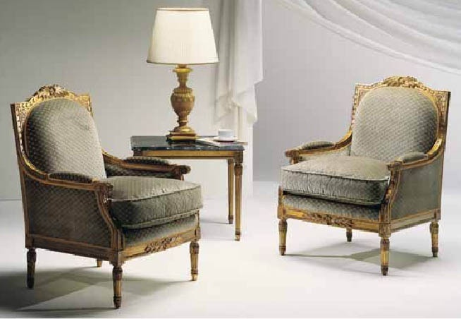 A chair from the Italian manufacturer Caspani Tino. Made in the classic style. Frame and shaped legs in solid wood. The surface is treated with glossy varnish. Upholstery textile. Color and texture to choose from a range of companies. Filler - polyurethane foam of different densities. The model is decorated with hand-carved.