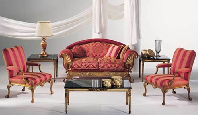 Sofa set due Adriano from the Italian manufacturer Caspani Tino. Set includes two seater sofa, two armchairs and a coffee table. Material - solid wood. Finish - gloss lacquer. Upholstery textile from the collection company. Countertop marble or glass. Each model is richly decorated with carvings.