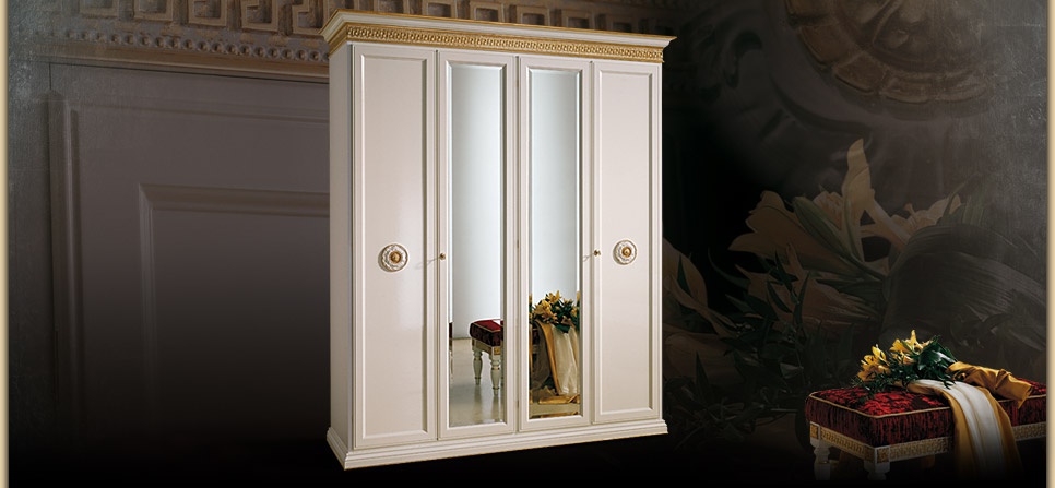 Wardrobe Naples from the Italian manufacturer Cenedese. The body is made of solid wood. The surface is covered with veneer and gilding. The upper part is decorated with handmade carving. Fold augmented mirror inserts. Handles are metal. The model is made in classic style.