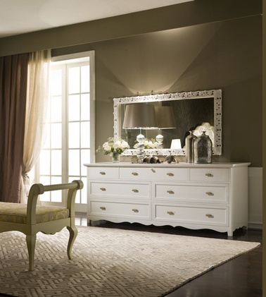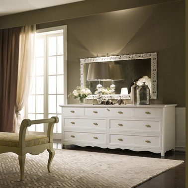 A chest of drawers from Italian manufacturer De Baggis. The frame is made of wood. Finishing varnish from the company portfolio. The legs are made from wood with decorative elements. The model is made convenient and roomy drawers in different sizes. Color scheme - white. Accessories - tree. The chest will perfectly complement the classic interior of bedroom in light tones.