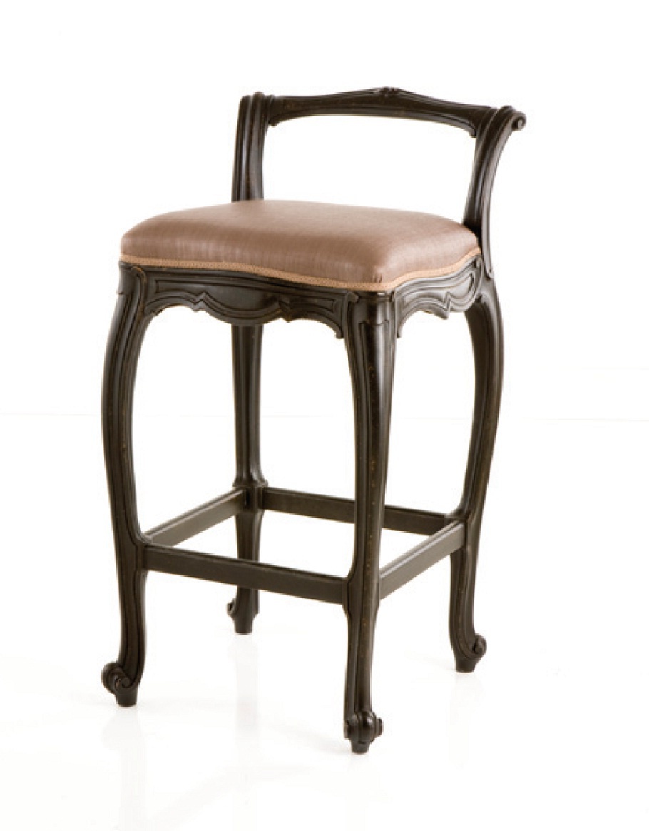 Bar stool from the Italian manufacturer Chelini. The frame and legs are made of solid wood. The varnish finish offered in black. Seat covered with textiles from the collection of the company. The surface is decorated with hand-carved artificially aged.
