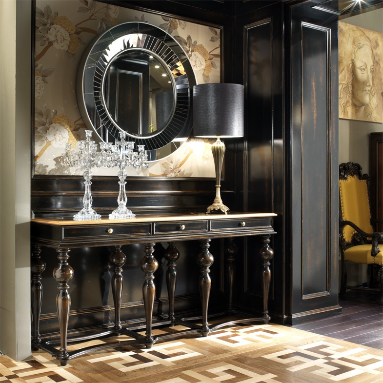 Console Arte Brotto VA1622 from the Italian manufacturer Arte Brotto. The body is made of solid wood. The model is decorated with carved decoration. A lovely choice for the living room in a classic style. Colors: natural wood color, black.
