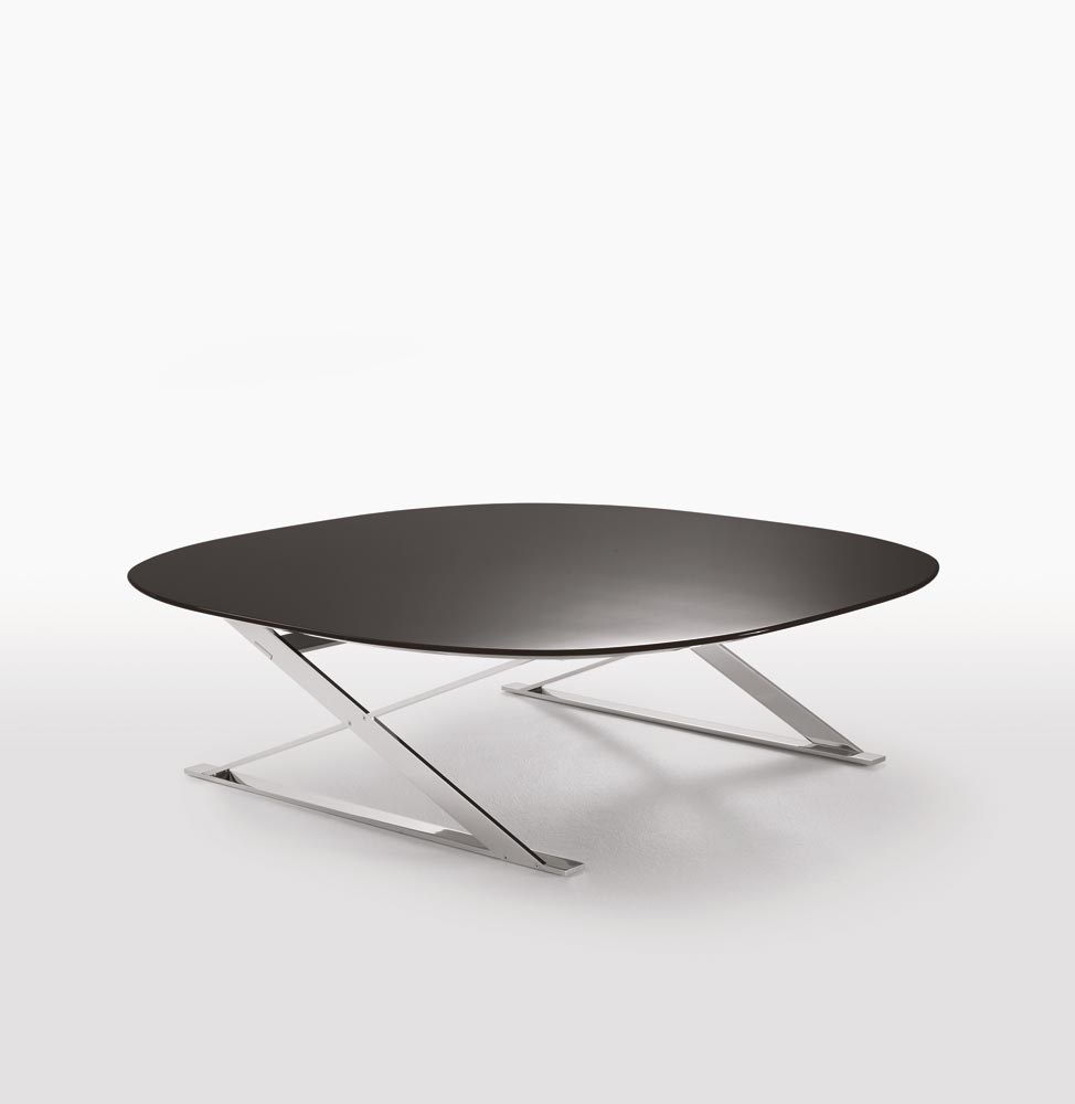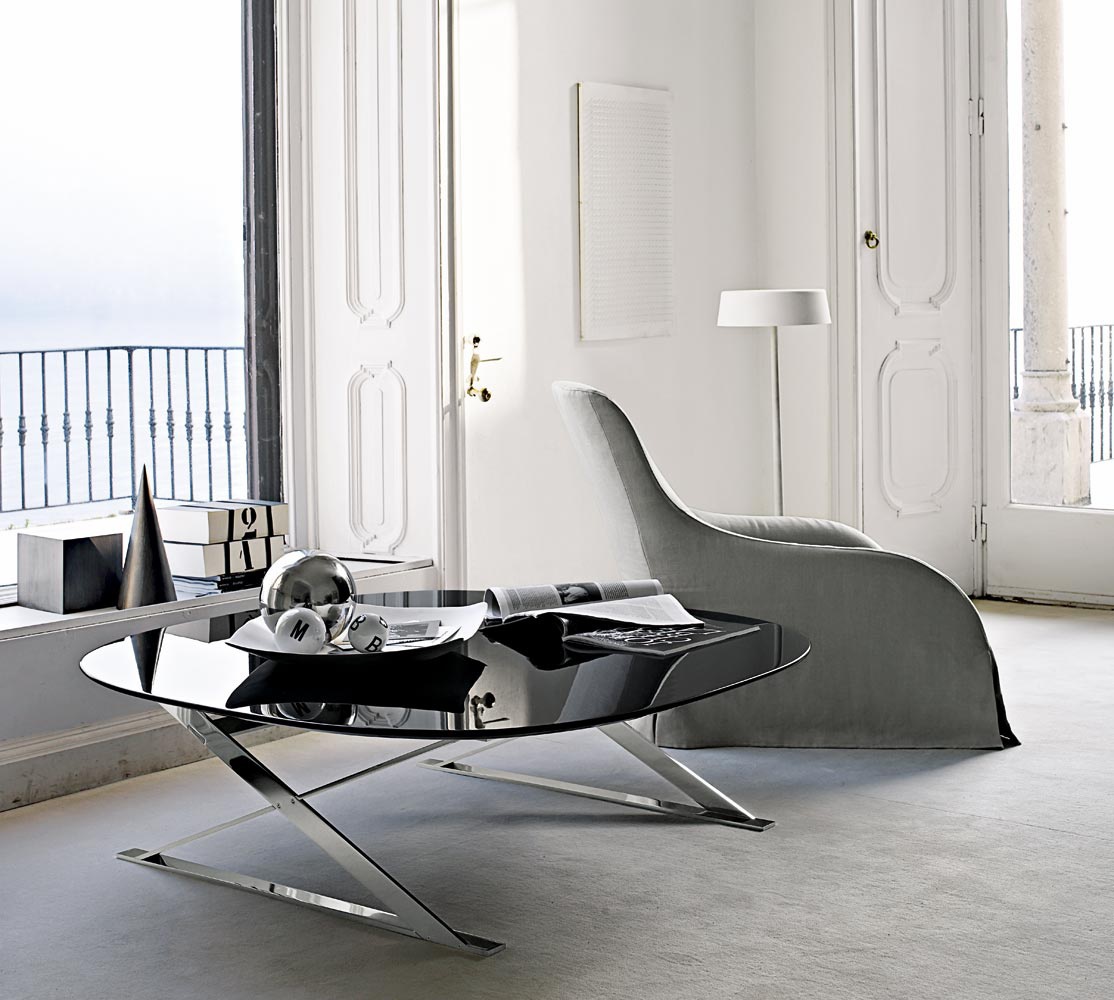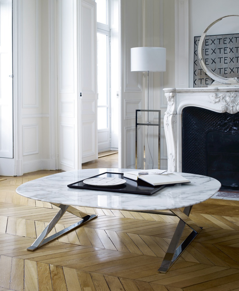 On the coffee table chrome-plated steel frame with marble top or MDF Pathos, B&B Italia