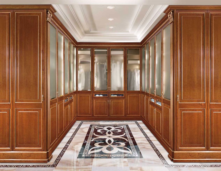 Royal Luxury dressing room from Faoma the Italian manufacturer. The product made of cherry wood with decoration in gold foil. The model is equipped with led backlight. A chic choice for dressing room in the classical style. Colors: brown, natural color of the wood.