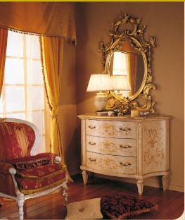 A chest of drawers from Italian manufacturer Gasperini. The frame is made of wood. The facade is decorated with floral decoration. Fittings - metal. Made a dresser with three drawers. The model is made in classic style.