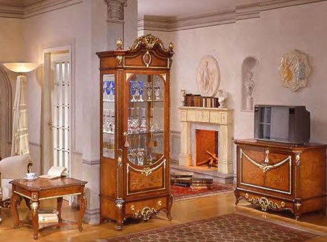 Cupboard from the Italian manufacturer Gasperini. The frame and legs wooden. The surface is covered with a glossy varnish. Sash, sides and glass shelves. Accessories metal. Decor - hand carved.