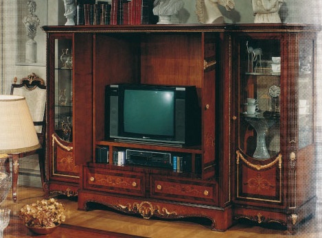 Cupboard from the Italian manufacturer Gasperini. Model with a frame made of wood. The surface is covered with a glossy varnish. Side sections complete with glass doors. Accessories metal. The Cabinet is made in classic style.