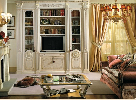 Bookcase from the Italian manufacturer Gasperini. The frame is made of wood, decorated with carving handmade. The sash is made of glass, closed with a key. The model suggests a niche for the TV. Color scheme - white. This model is made in classic style.