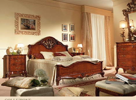 Double bed from Italian manufacturer Gasperini. The frame is made from solid wood. The bed is made with high headboard. Finishing varnish from the company portfolio. Headboard decorated with carved elements. The model is made in classic style.