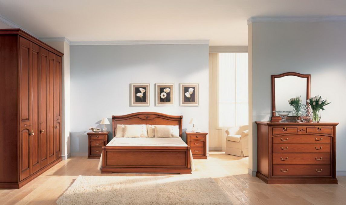Set for bedroom Piazza dei Signori of the Italian manufacturer Favero. Set includes: double bed with high headboard, bedside tables and chest of drawers. Frames made from solid wood. Finish - lacquer from a range of companies and carving. The model is made in classic style. Colors - brown.
