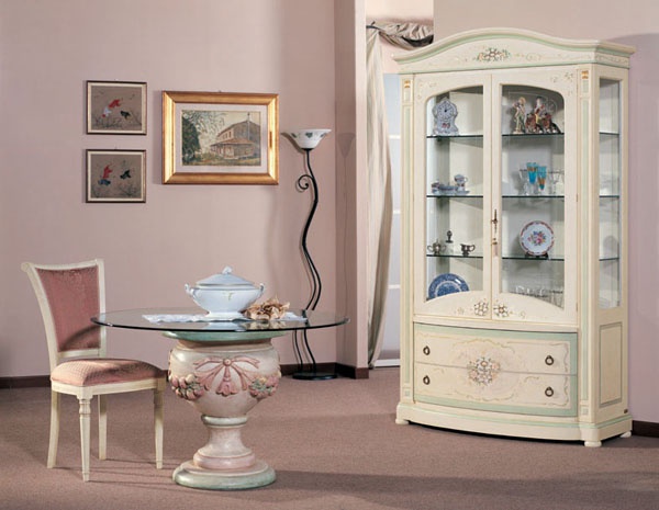 Showcase from Italian producer Alberto & Mario Ghezzani. The body is made from solid wood, the surface is treated with varnish from the range of the campaign. The doors and shelves glass. The model with two drawers. Showcase decorated with inlay. A chic choice for interior in classic style. Colours in stock.