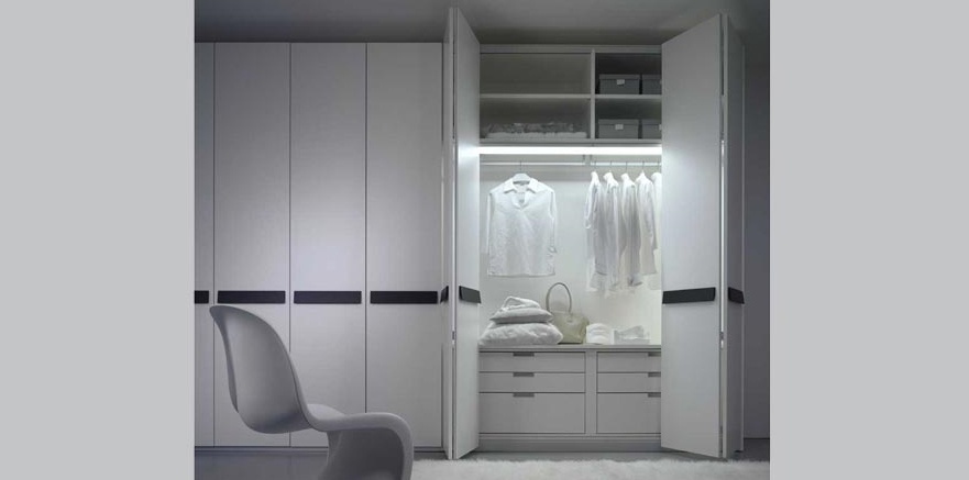 Closet from the Italian manufacturer Olivieri. The frame is made from solid wood. Color scheme in white. Sliding doors with dark wooden accents. Possible selection of colors in stock. The modern style of execution.