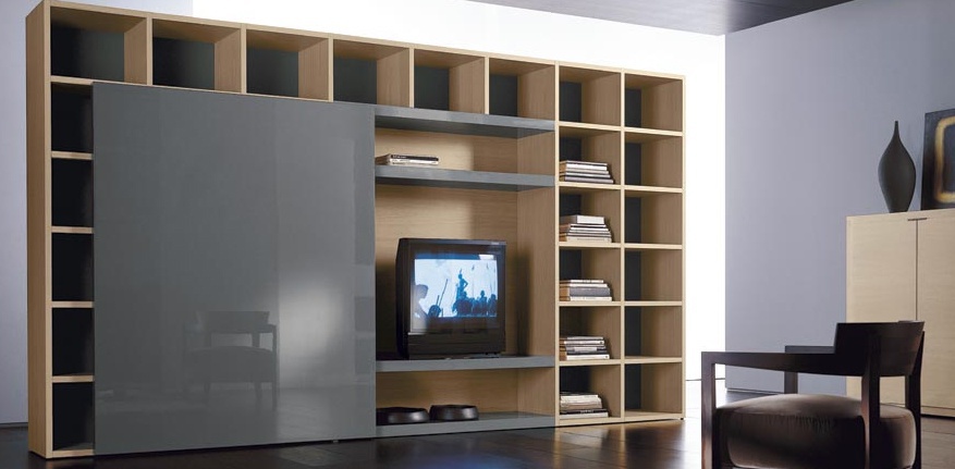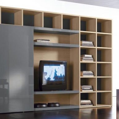Modular storage system from Italian manufacturer Olivieri. Consists of open shelves and hinged lockers. Frame of furniture is made from solid wood. Color in a gray tone. The perfect solution for modern interior.