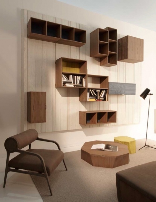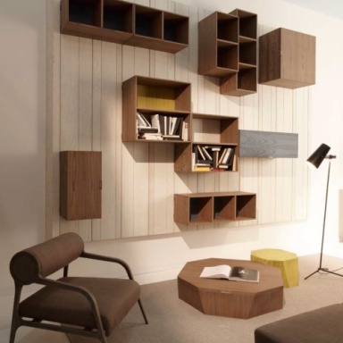 Sofa set from Italian producer Luciano Zonta. The material is solid wood of valuable breeds. The model is made in modern style. Equipped with a hinged bookshelf, a coffee table and a pouf in the form of stumps.