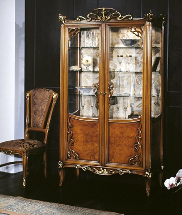 Showcase from Italian manufacturer Brogiato. The body is made from solid wood, doors and shelves glass. The elements - gold leaf. The model is decorated with carved decoration. Showcase with two swing doors. A great choice for interior design in liberty style. Colors: natural wood color, brown.