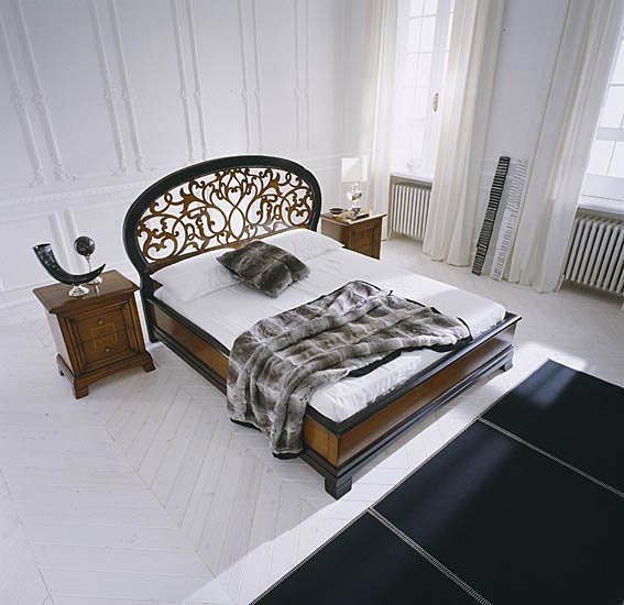 Double bed Italian manufacturer Dall'agnese. The head is rounded, with high carved decorative elements. Mounted on a wooden framework. Color from the manufacturer in brown with black colors. A style classic.
