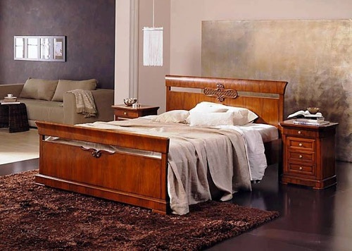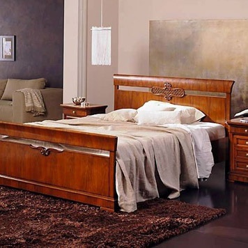 Headsets for bedrooms from Italian manufacturer Dall'agnese. The furniture is made on a wooden frame. The presented model is a double bed and two bedside tables with drawers. Bed with low headboard and footboard with decorative elements. Color from the manufacturer of natural wood. The modern style of execution.