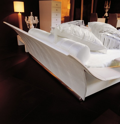 Bed with leather upholstery Piroga - Rugiano. The original line of bending of the back will allow You to create Your exclusive style bed glamour. For upholstery, use leather (snake and crocodile) and also leatherette. The model is available in white and brown colors.