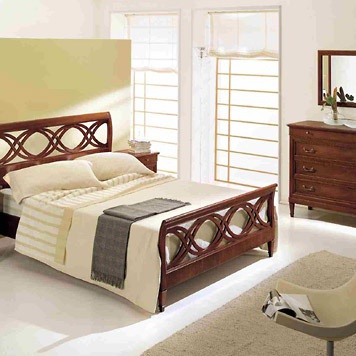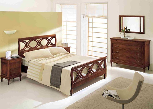 Headsets for bedrooms from Italian manufacturer Dall'agnese. Mounted on a wooden framework. The presented model beds with high headboard and footboard, chest of drawers and bedside tables for small feet. From the manufacturer color dark natural wood. The modern style of execution.