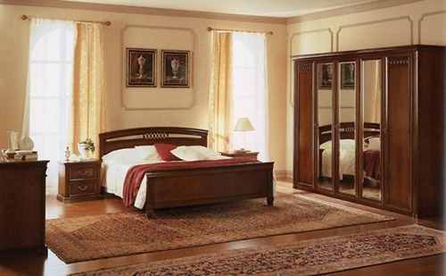 Headsets for bedrooms from Italian manufacturer Dall'agnese. Mounted on a wooden framework. The presented model of a double bed, wardrobe and bedside cabinets. Color from the manufacturer brown. The modern style of execution.
