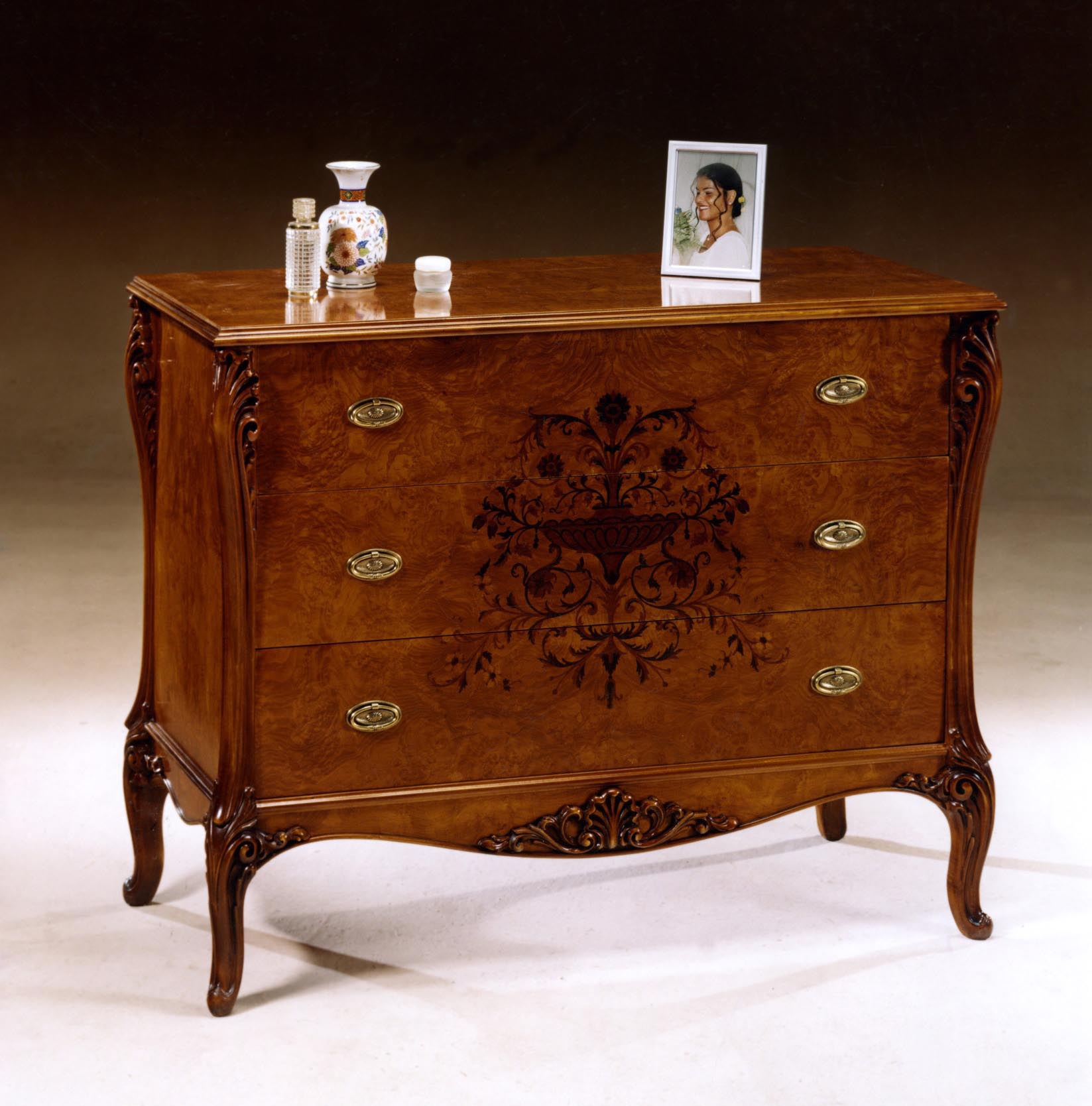 A chest of drawers from Italian manufacturer Brogiato. The body is made of solid wood. Handles - metal. The model is decorated with carved and inlaid decoration. Dresser with three drawers. A pretty choice for interiors in classical style. Colors: natural wood color, brown.