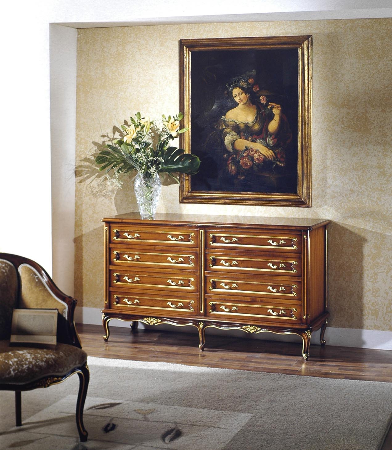 A chest of drawers from Italian manufacturer Brogiato. The body is made of solid wood. Fittings - metal. The elements - gold leaf. Carved legs. The model with eight drawers. The perfect choice for a living room in classic style. Colors: natural wood color, brown.