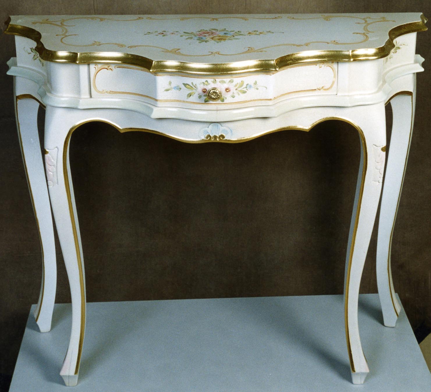 The console from the Italian manufacturer Brogiato. The frame is made from solid wood, the surface is treated with a varnish of white color. The model is decorated with inlay. Console with a drawer. A lovely choice for the living room in a classic style.