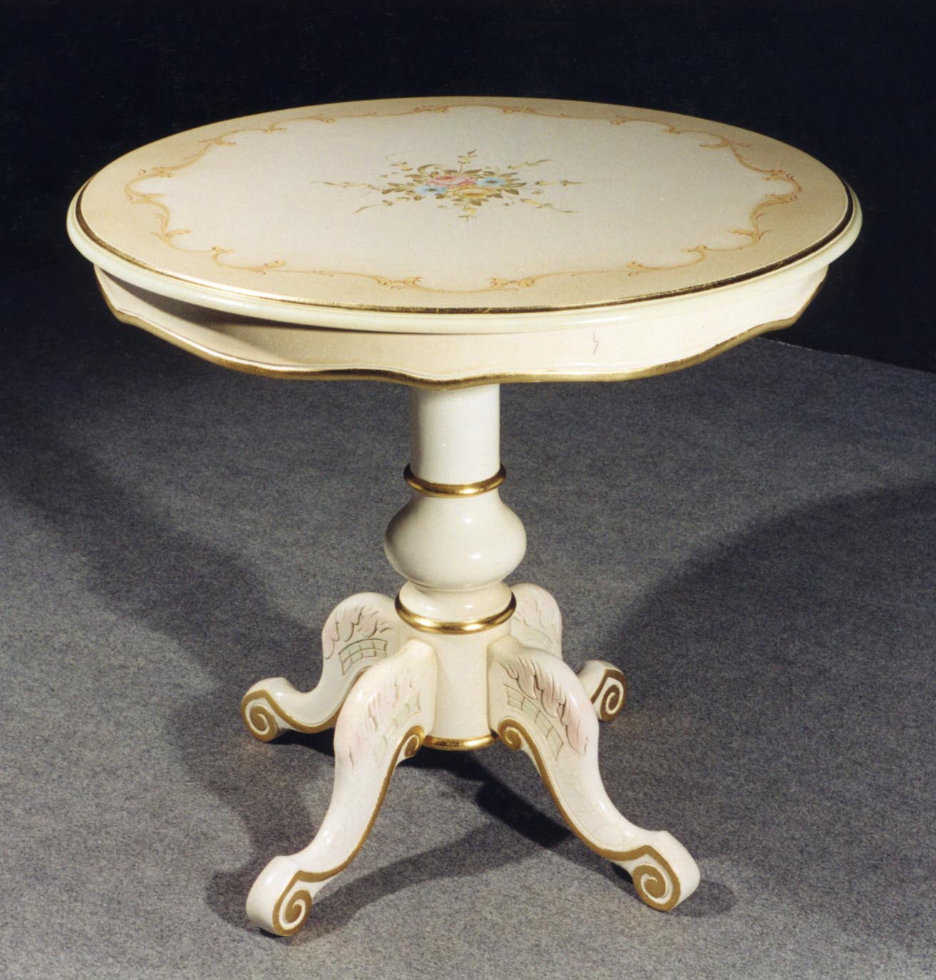 Dining table from the Italian manufacturer Brogiato. The frame is made from solid wood, the surface is treated with a varnish of white color. The model is decorated with inlay. Table round shape. A lovely choice for a dining room in classical style.