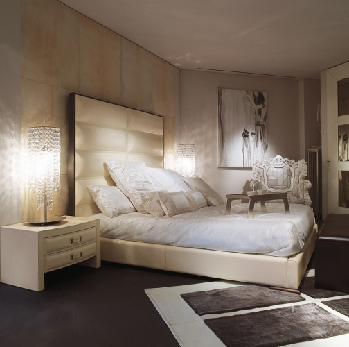 Bed with high upholstered back Mikado - Rugiano. The product is made in white color. High headboard is decorated with deep bands that create crisp geometric shapes. The furniture is produced in the style of glamour.